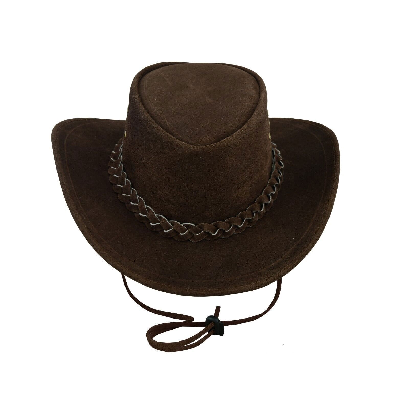 This comfortable and lightweight brown outback hat is designed with split cowhide leather. With a wide brim and distressing effect, it gives a tasteful rough and tough look to your western attire. It is also known as a vintage leather hat. It has grommets in the crown that provide ventilation. Moreover, a chin band is attached to it for comfortable wear. These hats are carefully designed to provide you with the best fitting that stays firm on your head.