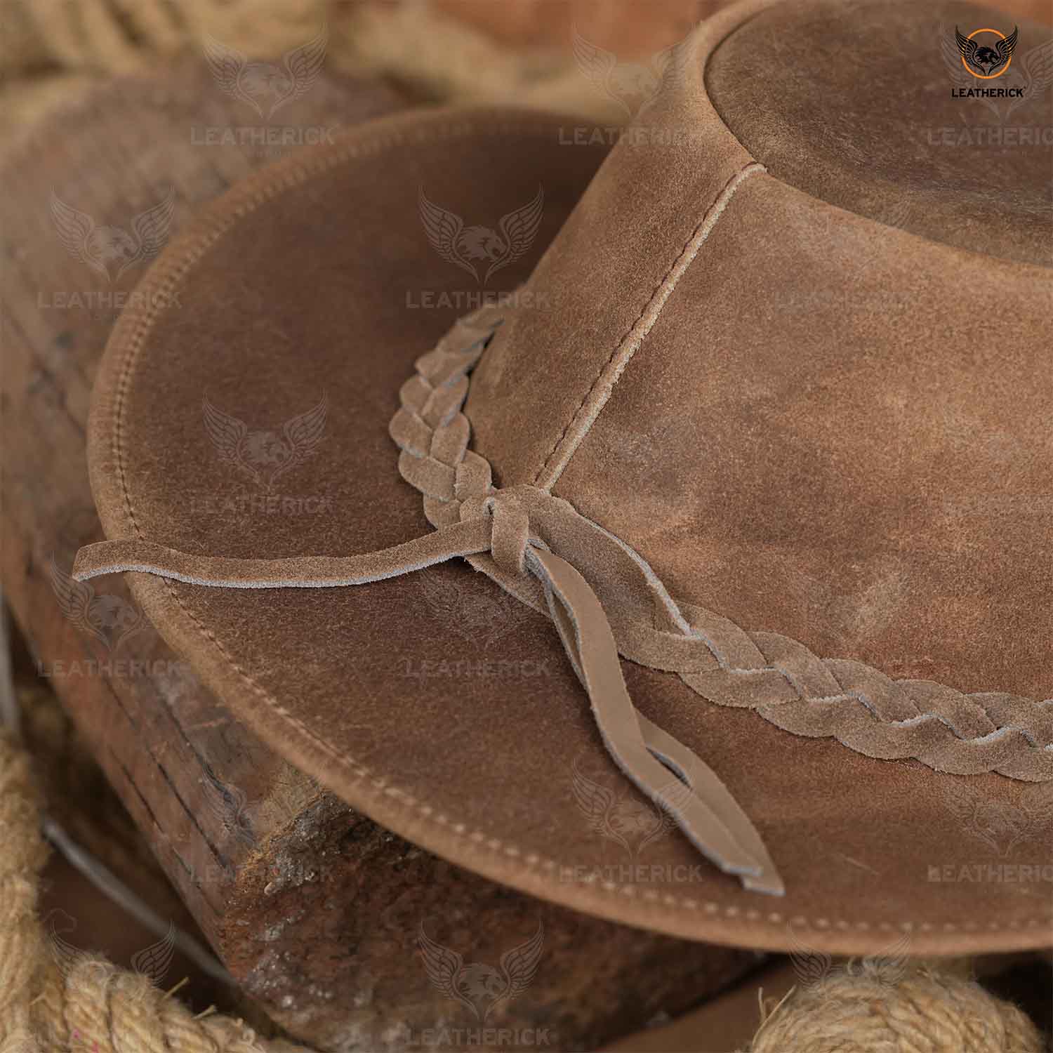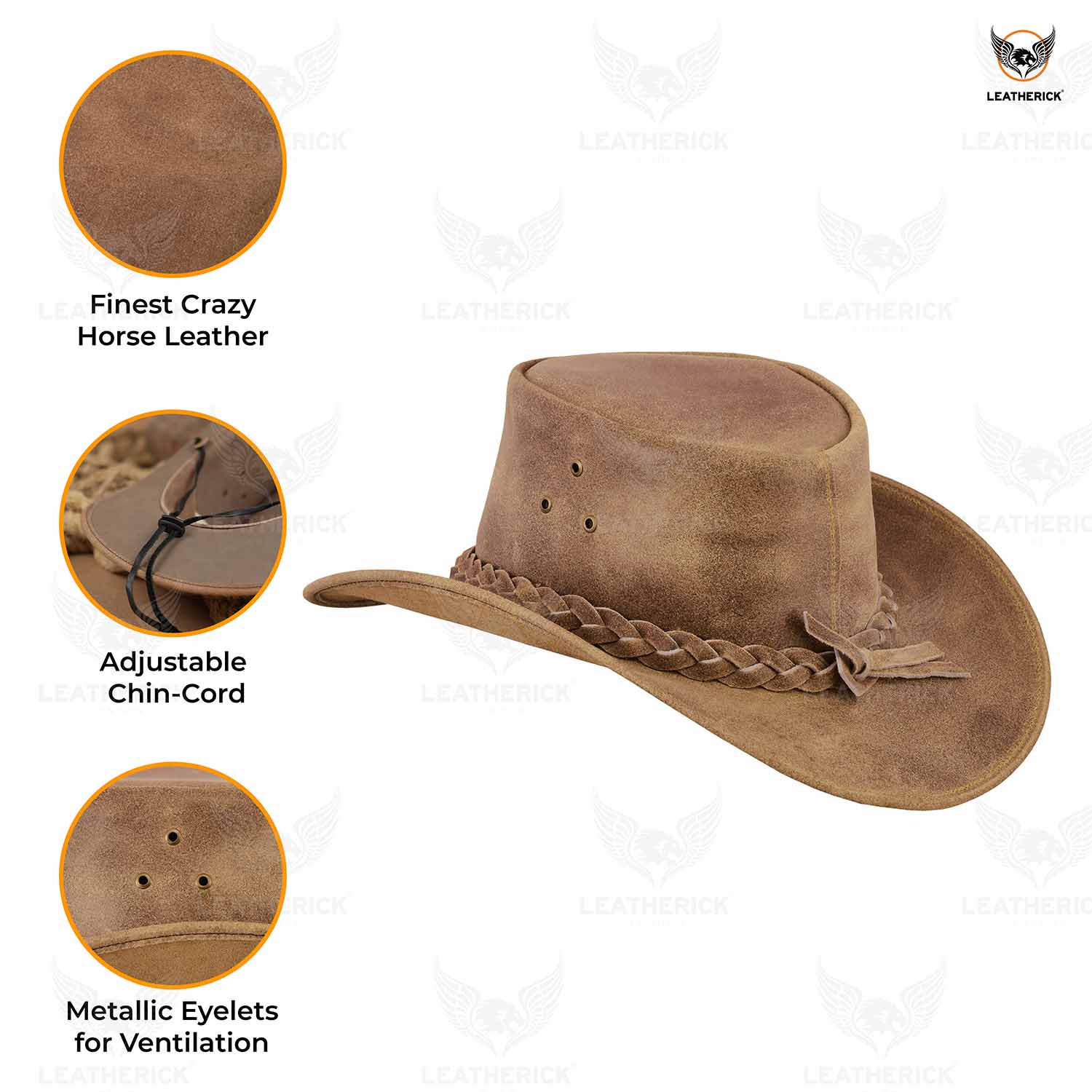 This crazy horse leather vintage hat has made from full-grain cowhide leather and it is stitched with premium stitching details. The design and material of the hat are sure to impress. This Split leather is very elegant and classic. Our outback hats for men are the best choice for outdoor activities. It has been designing with a comfortable liner that will absorb your sweat. It also provides 3 eyelets on each side for air ventilation.