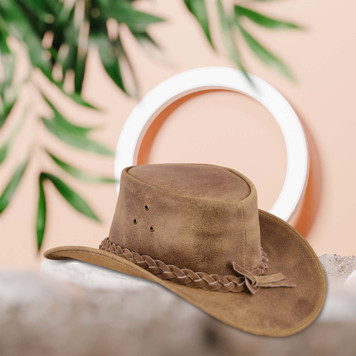 This braided style Western leather hat with a chin strap is the best hat for traveling. The Crazy Horse Leather is full-grain cowhide leather, which is of the highest quality for color and strength. The rich cowhide leather is cut and then buffed and smoothed out to give it a durable shiny and soft feel.