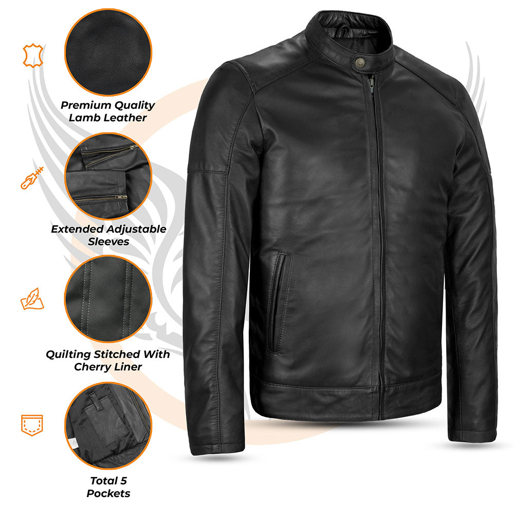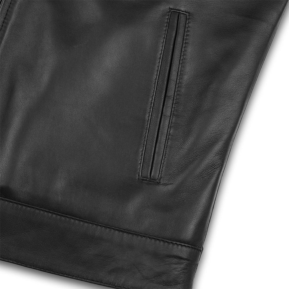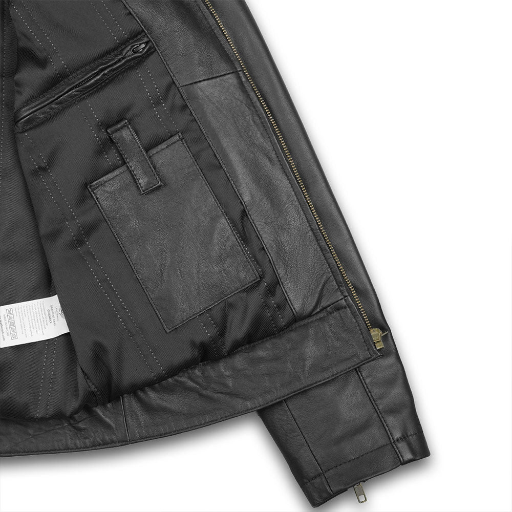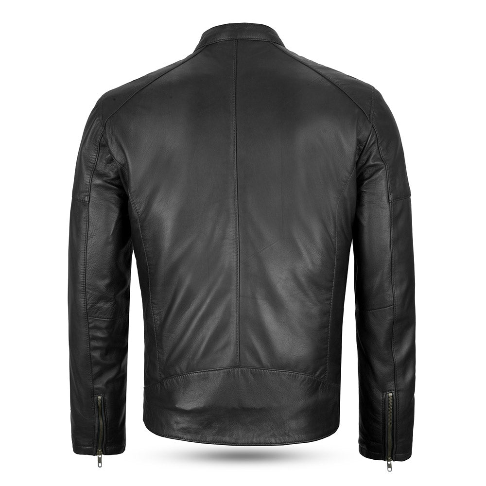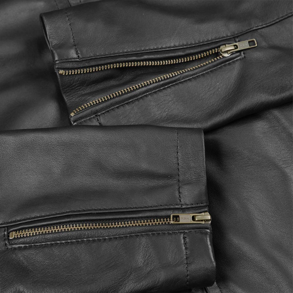 La chaqueta de cuero estilo motero LEO para hombre, confeccionada con cuero de cordero genuino para una combinación inigualable de estilo y durabilidad. Esta chaqueta de cuero NO EPI cuenta con una capa exterior de 0,8 mm de grosor, piel de cordero de primera calidad detrás del cierre de cremallera y en el interior de la cinturilla, y un forro acolchado Thinsulated de 50 g/m² para mayor calidez. Diseñada para motociclistas, viene con múltiples bolsillos, cremalleras de latón antiguo y un ajuste elegante, lo que la convierte en una incorporación esencial a tu guardarropa.